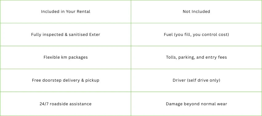 Yes. Airport pickup at Biju Patnaik Airport (BBI) is available for the Exter. Your car will be clean, fuelled, and ready when you land. For details, check our airport car rental page.