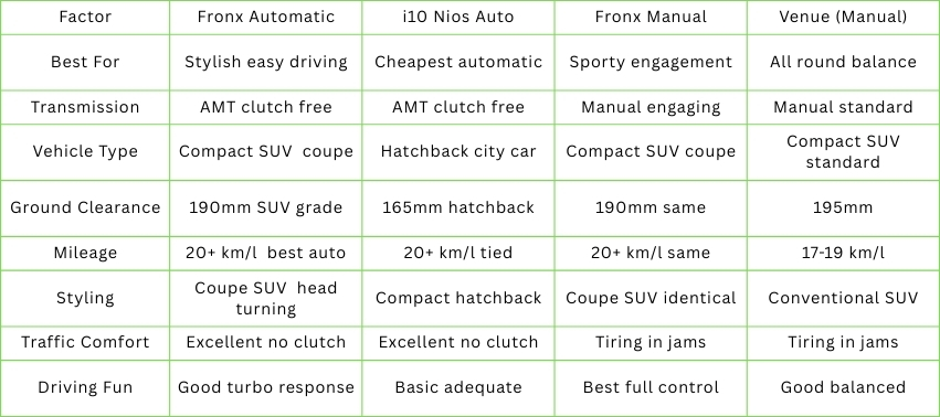 In particular, choose the Fronx Automatic if you want SUV styling and ground clearance with zero clutch fatigue. For maximum driving engagement, the Fronx Manual is the enthusiast’s pick. For the cheapest automatic in our fleet, see the i10 Nios Automatic. For premium SUV features, the Creta leads the range.