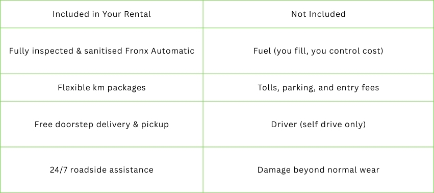 You receive the car with a set fuel level and return it at the same level. Fuel costs are not included in the rental rate, which means you control your spend entirely. The Fronx Automatic's 20+ km/l highway mileage means a Bhubaneswar to Puri round trip costs roughly ₹300 in fuel.